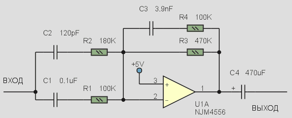 Реализовать такую АЧХ достаточно просто. Принципиальная схема одного канала усилителя стереотелефонов с системой S-XBS показана на рисунке 5.