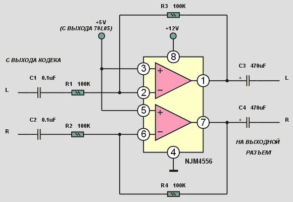 Обычно перед микросхемой усилителя мощности на звуковых платах устанавливают резистивный делитель напряжения, который уменьшает общее усиление. С учетом делителя оно составляет около 10 dB (примерно 3 раза). Для работы на стереотелефоны такой коэффициент усиления может оказатся избыточным, достаточно усиления 0 — 6 dB. Необходимый коэффициент усиления определяется номинальным сопротивлением и чувствительностью стереотелефонов, а также номинальным выходным напряжением кодека. Исходя из этих требований после анализа схемотехники звуковой платы была выбрана инвертирующая схема включения ОУ (рис. 1).