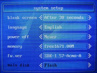 Что касается настроек интерфейса «под себя», то здесь перспектива не очень обнадеживающая: пункт Setup (настройки) содержит лишь: время подсветки дисплея, выбор языка, время автоматического выключения после простоя, количество свободной памяти, версию прошивки и выбор диска по умолчанию между SD-картой и внутренней Flash-памятью.
