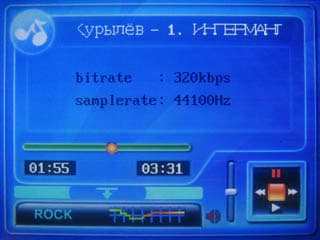 Проигрыватель выполнен не совсем стандартно: тэги плеер не понимает, отображается только имя файла. Во время воспроизведения на дисплее отображается частота дискретизации и битрейт файла. Кстати говоря, если битрейт переменный, отображается актуальное в каждый конкретный момент значение. Помимо этого на дисплее отображается полоса прогресса, режим воспроизведения, активный режим эквалайзера, уровень громкости.
