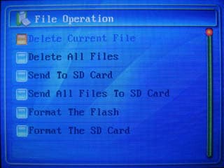 Интересной является возможность обмена файлами между внутренней памятью и SD-картой: можно перенести либо всю директорию сразу, либо файлы по отдельности. Также, разумеется, файлы можно удалять: сразу все или по одному. Встроенными средствами плеера можно отформатировать и карту памяти, и внутреннюю память плеера.