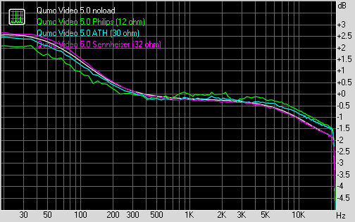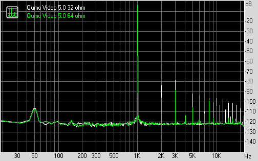 | Тест | Qumo Video 5.0 без нагрузки | Qumo Video 5.0 наушники Philips (12 Ом) | Qumo Video 5.0 наушники ATH (30 Ом) | Qumo Video 5.0 наушники Sennheiser (32 Ом) |
