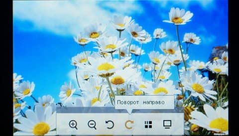 Список картинок представлен в виде превьюшек, по которым можно быстро составить представление о фотографии. Из опций просмотра поддерживается увеличение, уменьшение, поворот, слайд-шоу. Картинку можно установить как фон главного меню. В остальных местах (браузере файлов, видео- и аудиоплеере и в других режимах работы) всегда стандартная серая фоновая картинка.