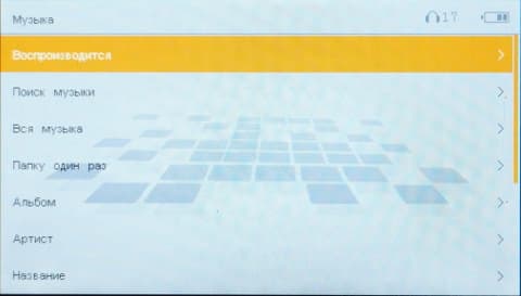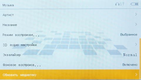 Проигрыватель музыки не такой, как мы привыкли видеть обычно. Здесь нет меню опций, которое вызывается во время воспроизведения — все настройки делаются перед открытием плеера и находятся в одном списке с библиотекой музыки. Библиотека состоит из стандартных «Альбом», «Артист», «Название» (это вместо привычной «Исполнитель») , «Вся музыка». По жанрам фильтра нет. Есть доступ к папкам, который называется почему-то «Папку один раз». Зачем один раз? :-)