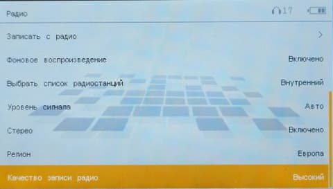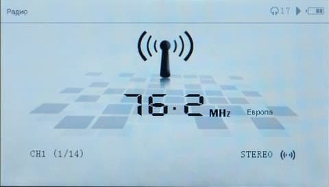 Приемник в плеере не простой: может как принимать FM-сигнал, так и вещать его. Например, вы можете слушать через магнитолу автомобиля музыку с плеера, настроившись на его волну. В настройках эту волну вы сами и выбираете. Сам же приемник по функциям стандартный: есть авто- и ручной поиск станций; запомненные станции можно просматривать в виде списка, чтобы быстро переключаться на нужную; настраивается регион, в зависимости от которого меняется диапазон частот. Стереорежим отключаемый. Качество приема неважное — постоянно щелчки и треск на фоне.