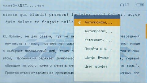 Читалка умеет открывать файлы TXT. Русский текст отображается правильно только в кодировке ANSI. Слова разрываются на конце строки и переносятся на следующую. Текст достаточно хорошо смотрится на экране, но настроек практически нет.