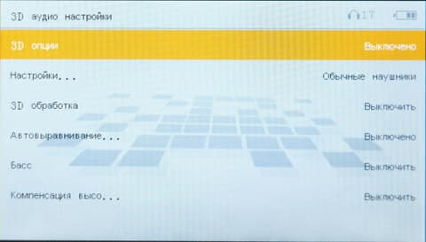 Далее — об опциях музыкального плеера. Есть 5 режимов воспроизведения (вперемешку, повтор всех и так далее). Среди них не нашлось места режиму, при котором зацикливается воспроизведение одного файла. Далее идет настройка 3D-«улучшайзера» звучания.