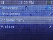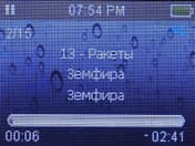 Теперь, пожалуй, настало время поговорить о нестандартной кнопке. Как вы уже, наверное, заметили, кнопка навигации всего одна. Используется она во время проигрывания музыкального файла и служит для перехода к предыдущему/последующему треку. Долгим на нее нажатием можно настроить, в какую сторону нужно «щелкать» треки. По умолчанию она настроена на направление «вперед». Эта особенность, как вы уже могли догадаться, не позволяет при помощи данной кнопки производить перемотку в рамках одного трека: для этого есть свой способ. Подобно iPod, прикосновениями к середине сенсорной панели открывается дополнительная информация: после первого прикосновения ползунок перемотки, двигая который можно быстро переместиться в любое место трека. При этом воспроизведение не ускоряется, а после того как вы выбрали нужный момент, начинается сразу же с него. После второго прикосновения отображается информация о проигрываемом треке: имя артиста, название альбома, композиции, битрейт, частота дискретизации, а также имя файла. Нужно отметить, что места на дисплее не хватает для полного отображения всех полей, и исправить данную ситуацию никак нельзя прокрутка отсутствует. Но иногда и этой информации может хватить. Последующее прикосновение к сенсору включает визуализацию.