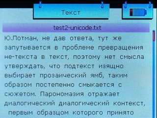 Устройство открывает файлы TXT. Просмотрщик отображает заряд батареи, заголовок меню, заголовок файла и, собственно, сам текст. Буквы довольно ровные, но очень маленькие и настройке не поддаются, к большому сожалению. Выйти в полноэкранный режим отображения нельзя.