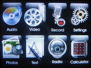 Главное меню состоит из пунктов Audio, Video, Record, Settings, Photos, Text, Radio, Calculator. Названия функций, вне зависимости от установленного языка, всегда английские. Выделенная иконка снабжается простенькой анимацией. Загрузка каждой функции не заставляет ждать долго, равно как и загрузка самого плеера: время между сдвигом ползунка включения и «боевой» готовностью составляет около пяти секунд, в течение которых на экране отображается анимация.
