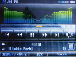 После двойного щелчка по Audio сразу начинается воспроизведение. Воспроизводится, разумеется, та песня, которая проигрывалась последней перед выключением. Оформление данной функции также вызывает положительные эмоции, как и оформление меню, — кнопки управления треками и некоторые другие элементы, что присутствуют на дисплее, являются прозрачными, а на задний фон можно поставит любую картинку. Уровень прозрачности, к счастью, настраивается. Было замечено, что на фоне отлично смотрится практически любая адекватная фотография (пример неадекватной — скриншот дисплея самого плеера). Не подлежат изменению: визуализация, бегунок прогресс-бара, информация о треке, нижняя строка дополнительной информации. При этом кнопки управления треками можно сделать невидимыми, но это, наверное, для особых энтузиастов. Для всех функций можно поставить свою уникальную фоновую картинку со своим уровнем прозрачности.