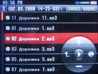 А об устройстве браузера файлов отдельный разговор. Для скроллинга по левому краю экрана расположена полоса прокрутки, пользоваться которой, мягко говоря, неудобно: при медленном скольжении стилусом/ногтем список начинает дрожать и узреть нужные слова становится проблематично. Разработчики весьма оригинально решили данную проблему: в правом нижнем углу дисплея расположен круг, который состоит из пяти частей: сверху-снизу клавиши «+» и «-», слева кнопка перехода к каталогу уровнем выше, а справа — включение «колеса». В центре расположена кнопка Play/открыть. Суть данного нововведения, наверное, понятна: для облегчения перемещения по папкам сделан также прозрачный блок, который и названия файлов/папок не загораживает, и функции свои выполняет очень корректно. «+» и «-» служат для точной подгонки выделения нужной строки, а при нажатии на правую часть «колеса» включается режим быстрой перемотки списка: подобно «click wheel» iPod’ов, скольжение происходит по кругу. Реализована данная функция удобно. Практически нареканий нет ни при управлении пальцем, ни при управлении стилусом. Быстро перемотали «колесом», плюсом/минусом выбрали точный файл/папку — и готово.