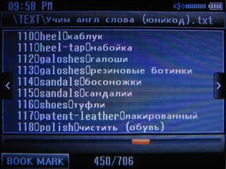 Аппарат поддерживает текстовые файлы с расширением TXT и только в кодировке Unicode. Остальные также открываются, но некоторые символы отображаются некорректно. Реализацию просмотрщика можно назвать хорошей лишь в том случае, если она будет использоваться для просмотра мелких заметок. В качестве «читалки» электронных книг плеер, конечно, подойдет, но: 1) очень большая часть дисплея занята ненужной во время чтения информацией; 2) слова обрываются на конце строки; 3) нет настроек шрифта и фона. В остальном — идеальная читалка. Удобно перелистывать экраны — не требуется точного попадания по стрелкам, необходимо лишь прикоснуться к правой или левой части дисплея для перелистывания соответственно вперед/назад. Присутствует полоса прогресса с ползунком, который можно двигать и, соответственно, перемещаться по текстовому файлу. Отображается и номер текущей страницы/количество всех страниц. Если привыкнуть к вышеописанным особенностям, то и книги почитать вполне можно.