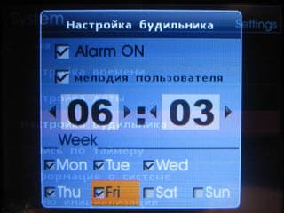 Будильник. Поначалу нам показалось, что без динамиков, подключенных к плееру, от него толку маловато. Но однажды, настроив эту функцию на определенное время и забыв об этом, услышал писк — оказалось, "пищалка" спрятана внутри.
