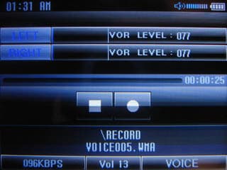 Запись с линейного входа и функция диктофона спрятаны под пунктом Record главного меню. Поговорим вначале о последнем. Как ни странно, запись начинается сразу после открытия диктофона. На дисплее при этом отображаются битрейт, громкость, а также кнопки паузы и остановки записи. Присутствует уровень записи для двух каналов, который работает весьма сносно. Также была обнаружена не совсем обычная возможность: можно собственноручно задать порог чувствительности микрофона.