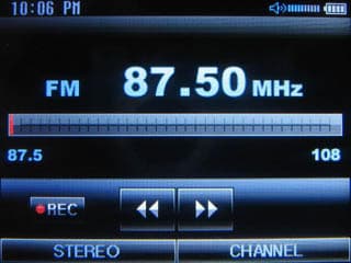 Радио. Данная функция исполнена весьма удобно. Прием ведется по FM-диапазону от 87,5 до 108 МГц. Имеется возможность выбирать между mono и stereo режимами, что полезно при нестабильном стереосигнале. Разумеется, станции можно заносить в память вручную, либо в режиме автопоиска. Правда, в ручном режиме запоминать их придется «вслепую» — списка пресетов нет, и номера их будут записаны в порядке очередности создания.