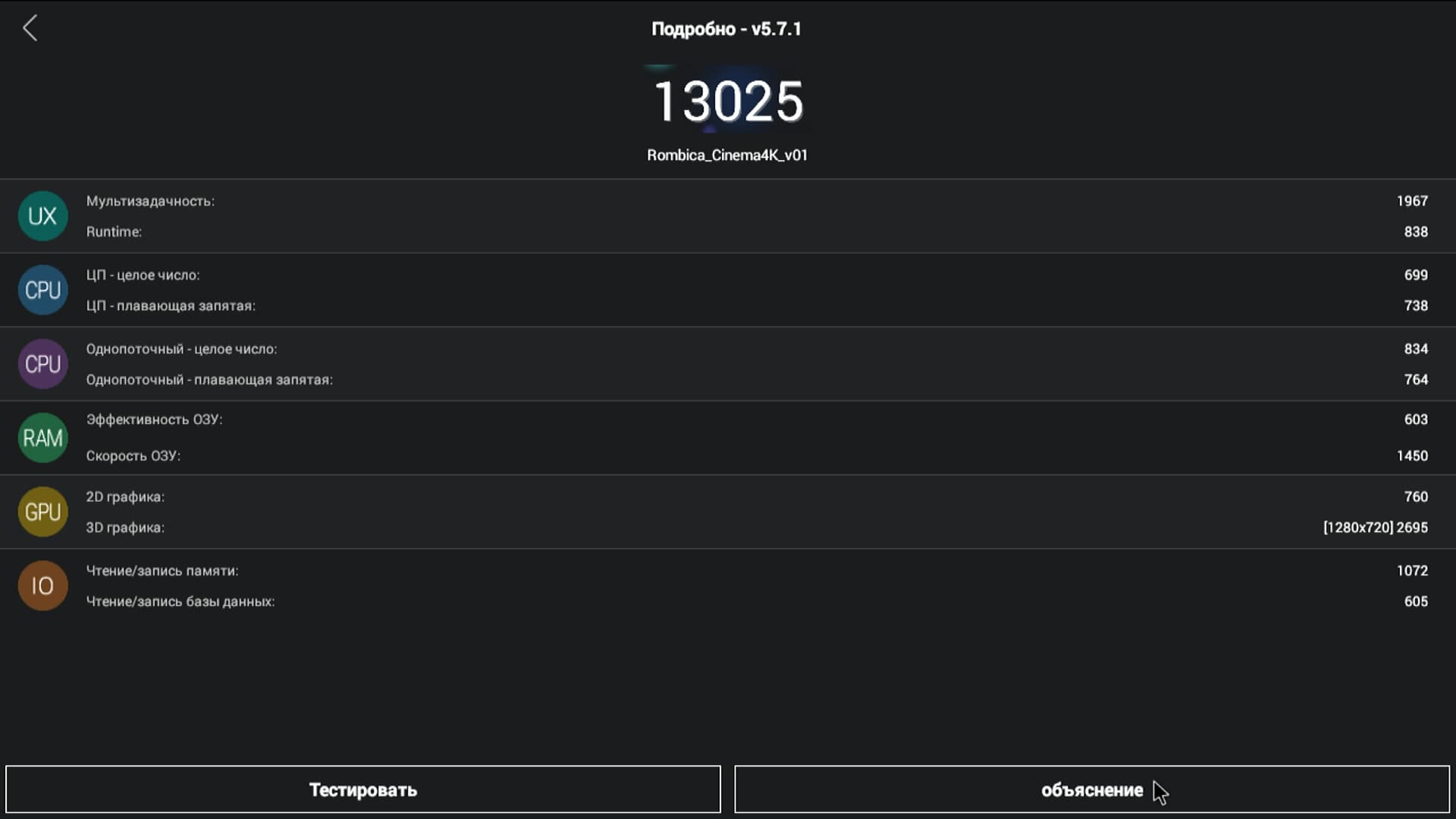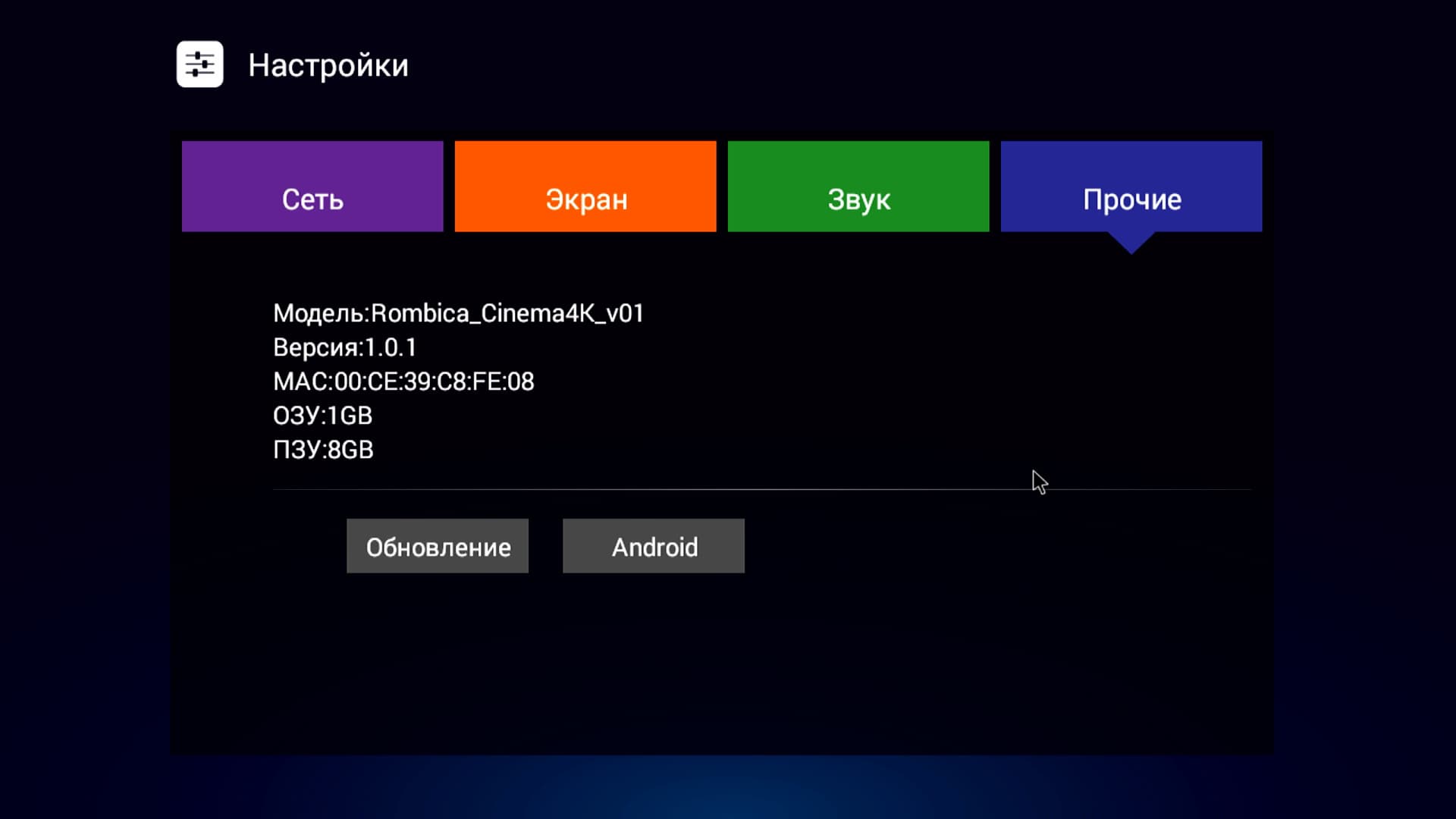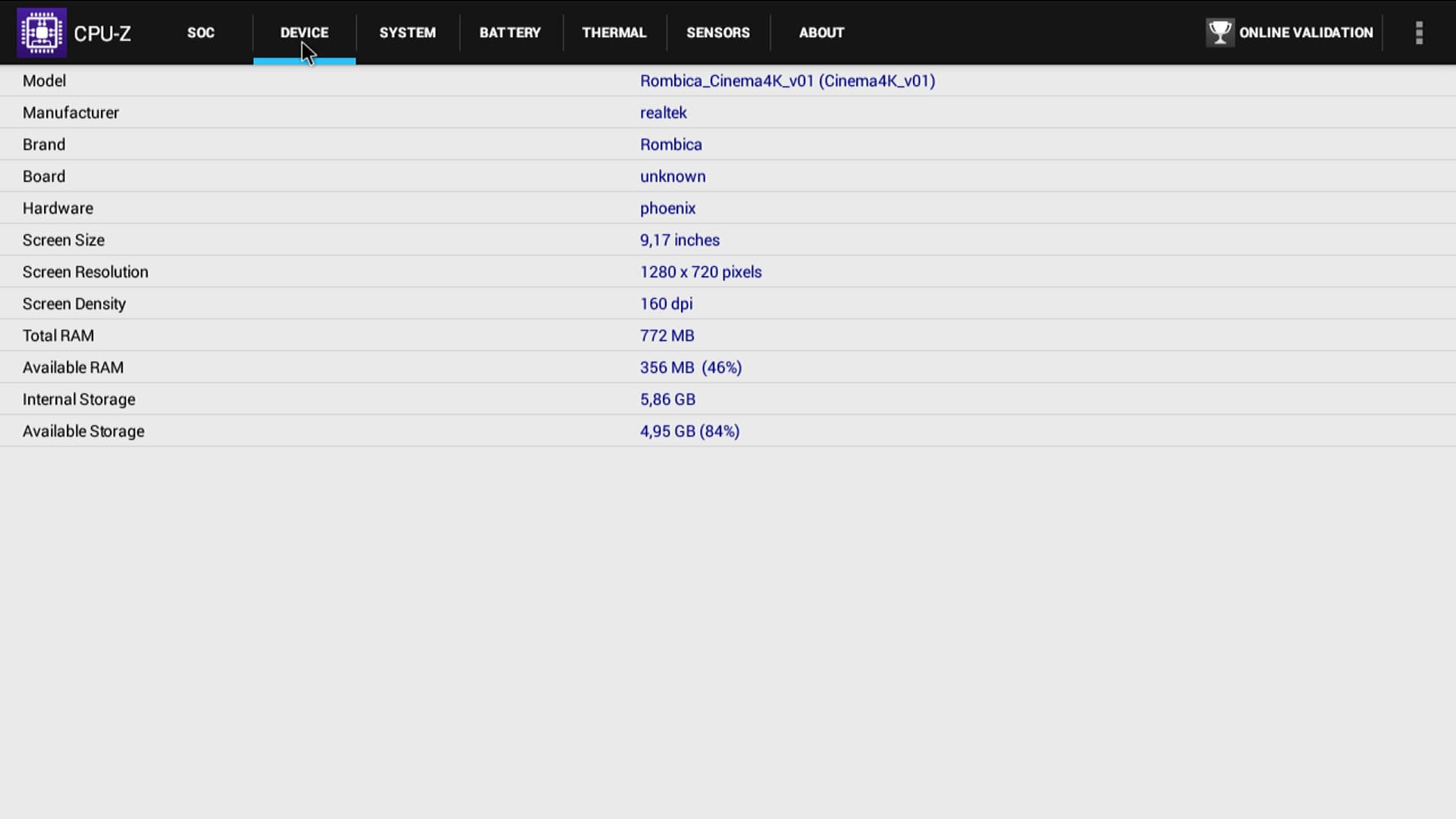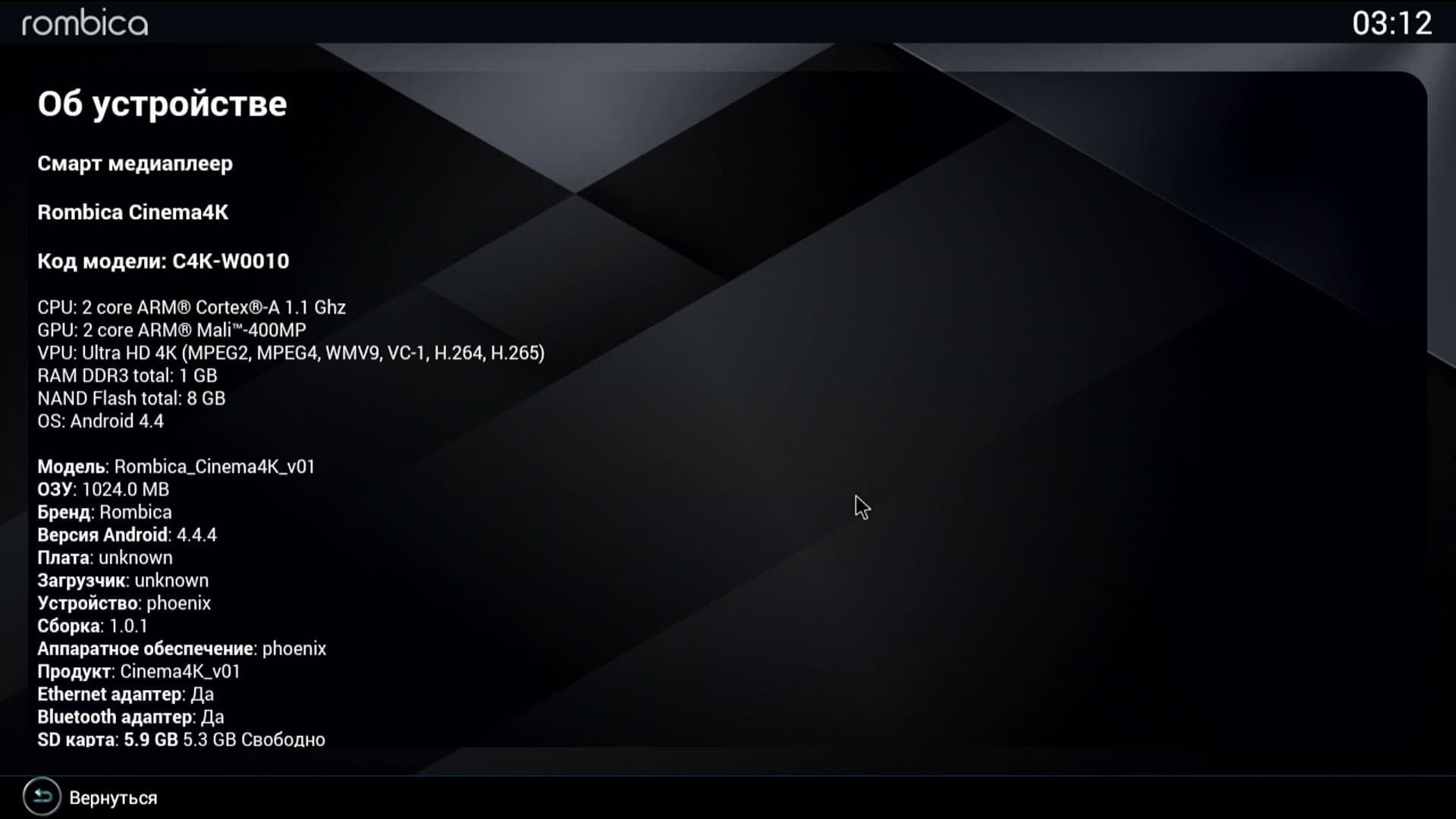 Полученная информация кажется странной. Точнее, один пункт, а именно — разрешение экрана, которое здесь составляет всего 1280×720 точек. Разумеется, никакого дисплея у рассматриваемого устройства нет — эти сведения относятся к программному виртуальному дисплею, с которым оперируют некоторые приложения, запускаемые на устройстве. Потому и непонятно, каким же образом медиаплеер, который, согласно заявленным характеристикам, воспроизводит 4K видео, имеет такое миниатюрное разрешение экрана, пусть и виртуального. Начинаем полагать, что все эти значения, получаемые информационным приложением, берутся из «вбитых» в прошивку плеера данных, причем вбитых наобум, а практическая ценность их приближена к нулю.