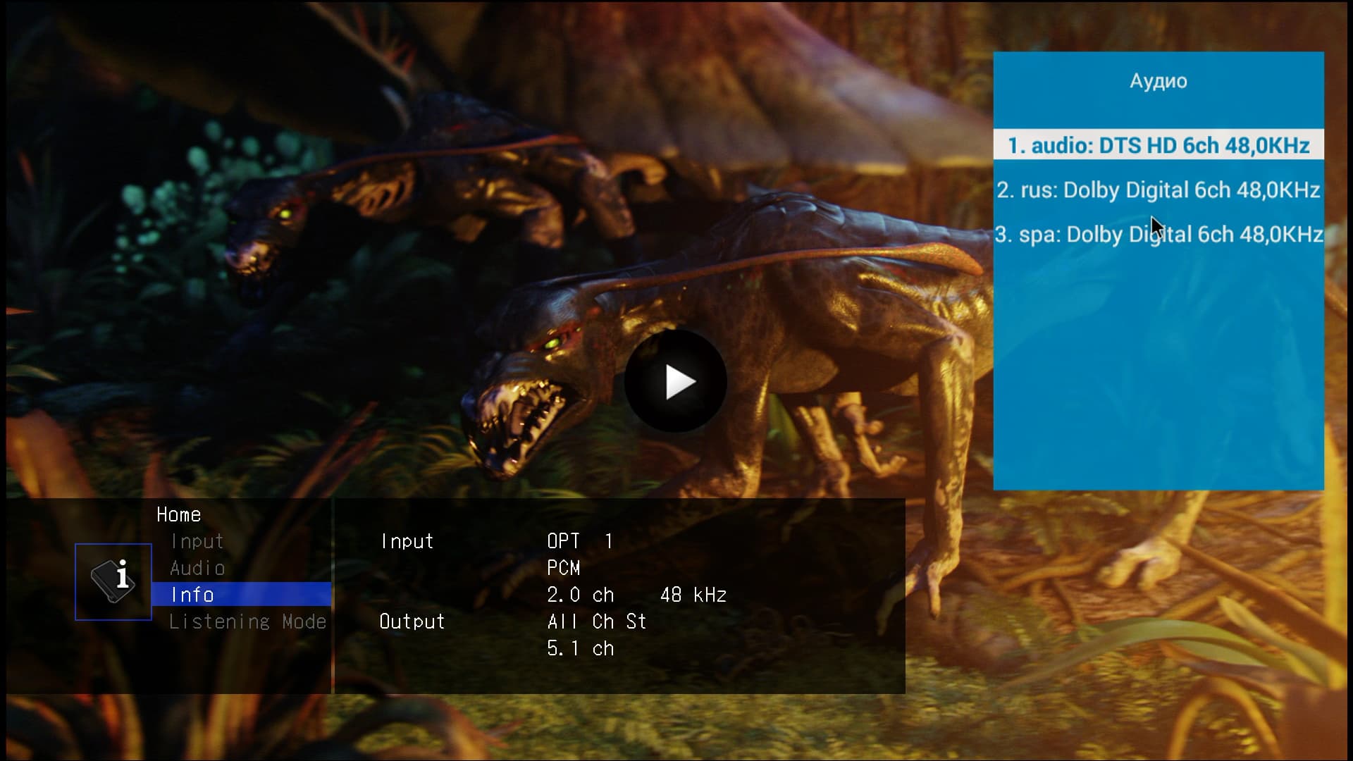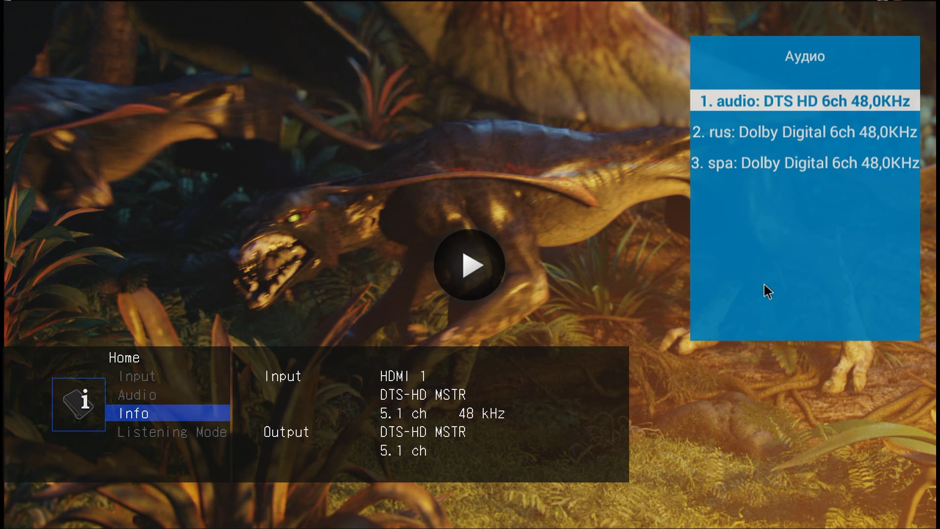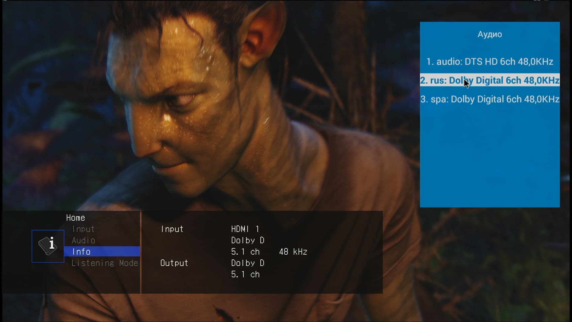 Для этого подключим наш плеер к HDMI входу аудиоресивера, а HDMI видеосигнал с этого ресивера пустим в устройство захвата — нужны же ведь стоп-кадры, доказывающие наличие многоканального и HD звука. А вот и они, стоп-кадры, содержащие информационный блок ресивера, в котором показывается формат аудиосигнала, поступающего с плеера на ресивер: