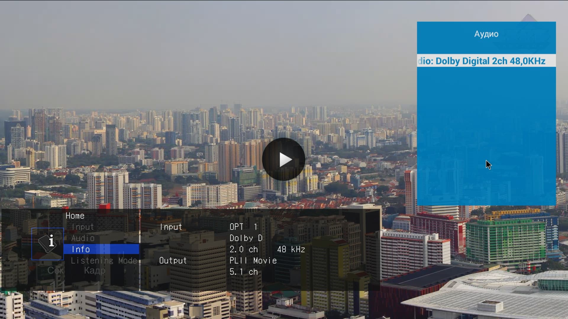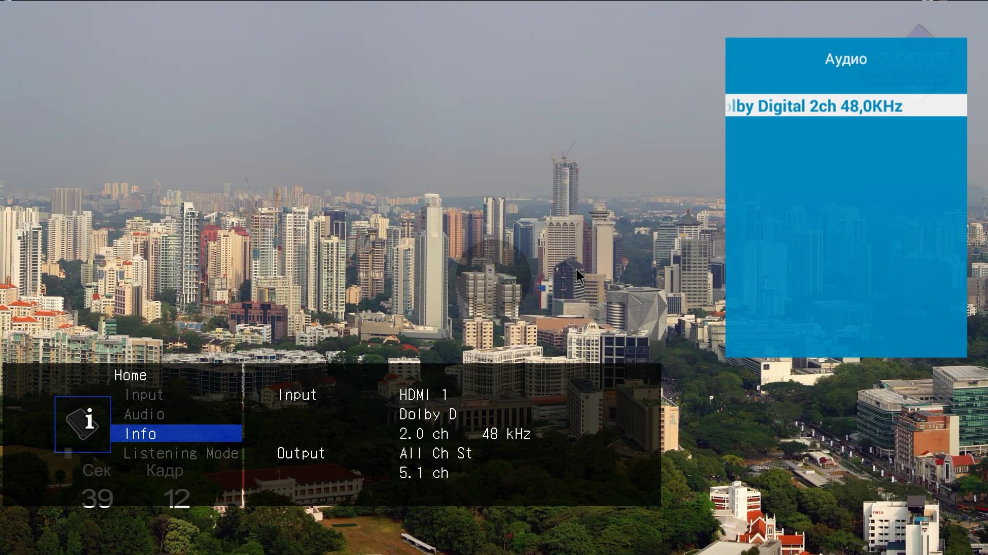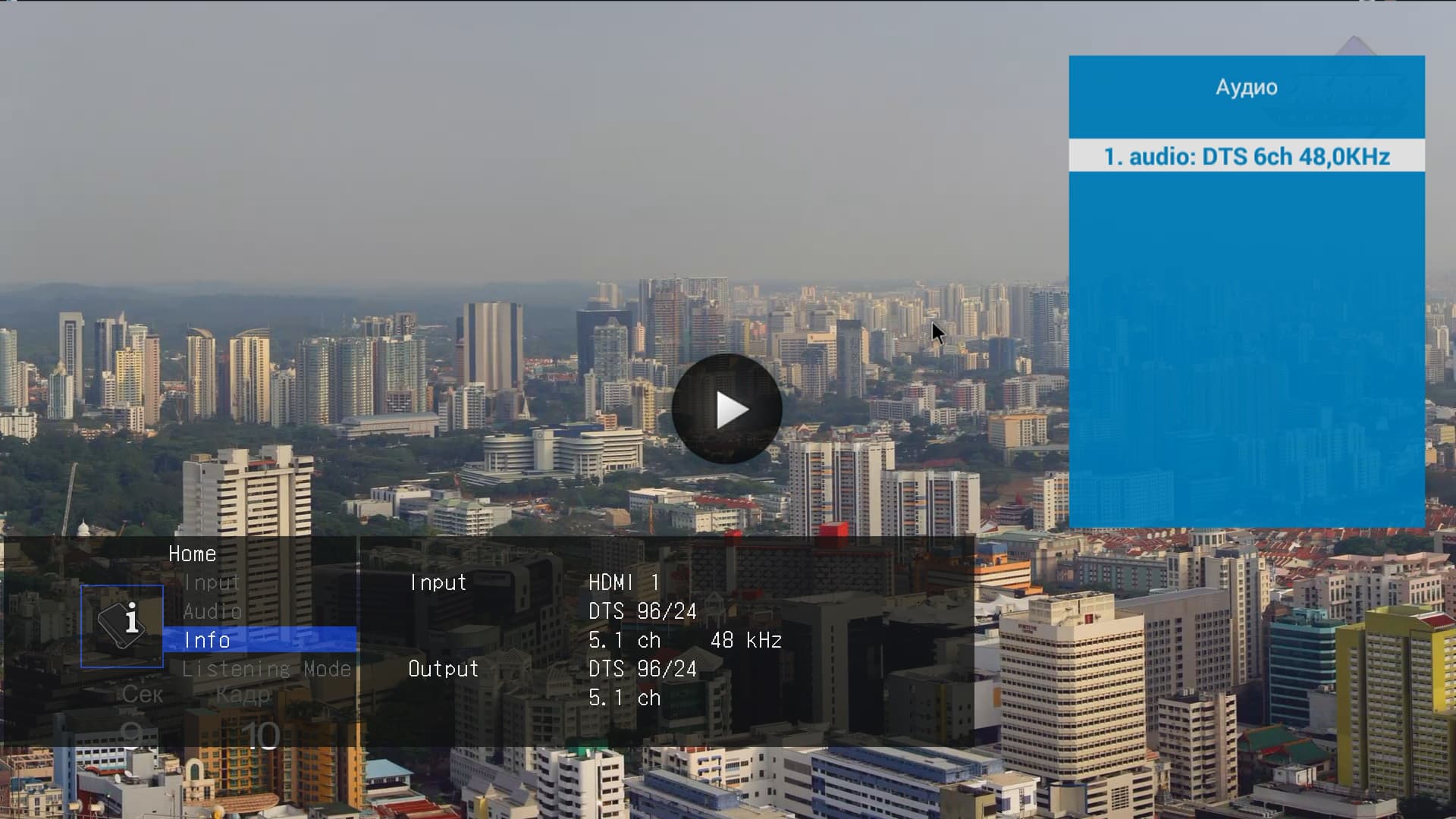 Для этого подключим наш плеер к HDMI входу аудиоресивера, а HDMI видеосигнал с этого ресивера пустим в устройство захвата — нужны же ведь стоп-кадры, доказывающие наличие многоканального и HD звука. А вот и они, стоп-кадры, содержащие информационный блок ресивера, в котором показывается формат аудиосигнала, поступающего с плеера на ресивер: