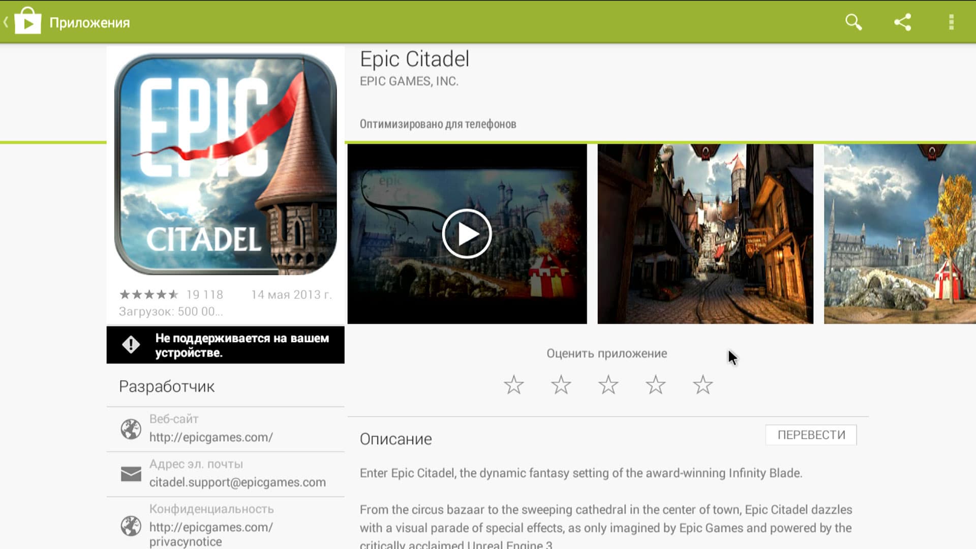 Сервис Google Play, видимо, еще не в курсе о существовании нашего устройства, хотя название плеера и информация о нем корректно отображаются в списке присоединенных к аккаунту устройств. Но ничего страшного, воспользуемся обычной локальной установкой APK-файла.