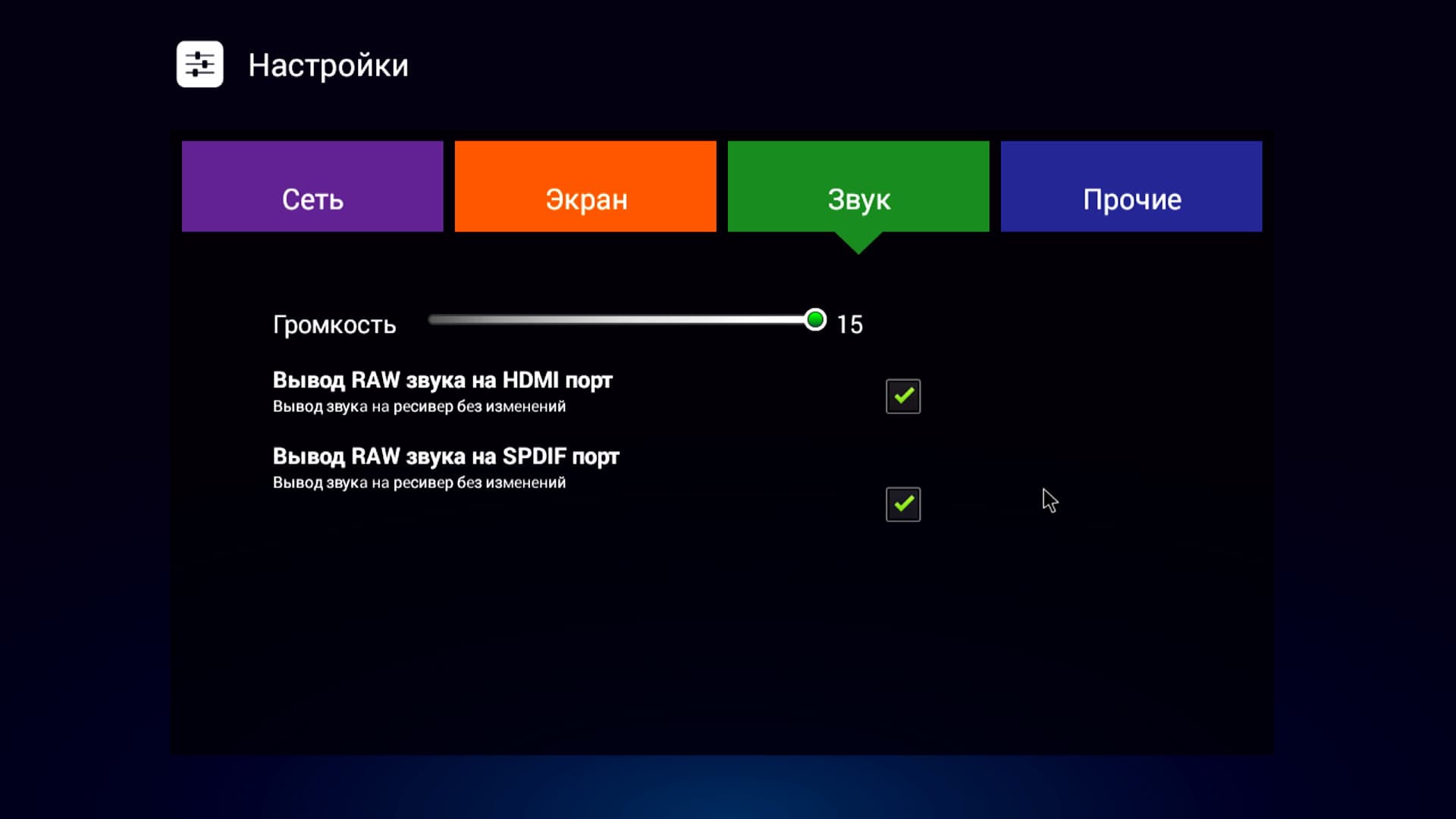 Помимо стандартных Android-ных настроек, плеер имеет и фирменные, где повляется возможность определиться с настройками сети, выбрав проводное или беспроводное подключение. В параметрах видеовыхода доступны буквально все существующие ТВ-стандарты, частоты и размеры кадра. Настройки звука представляют особенный интерес, ведь здесь — внимание! — находится желанный для многих пункт RAW, о котором мы обязательно расскажем отдельно. Наконец, в последнем пункте настроек прячется средство обновления системы.