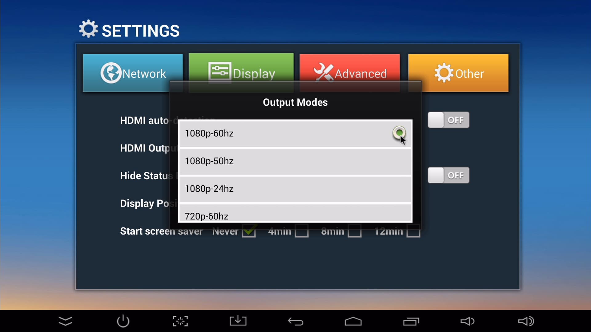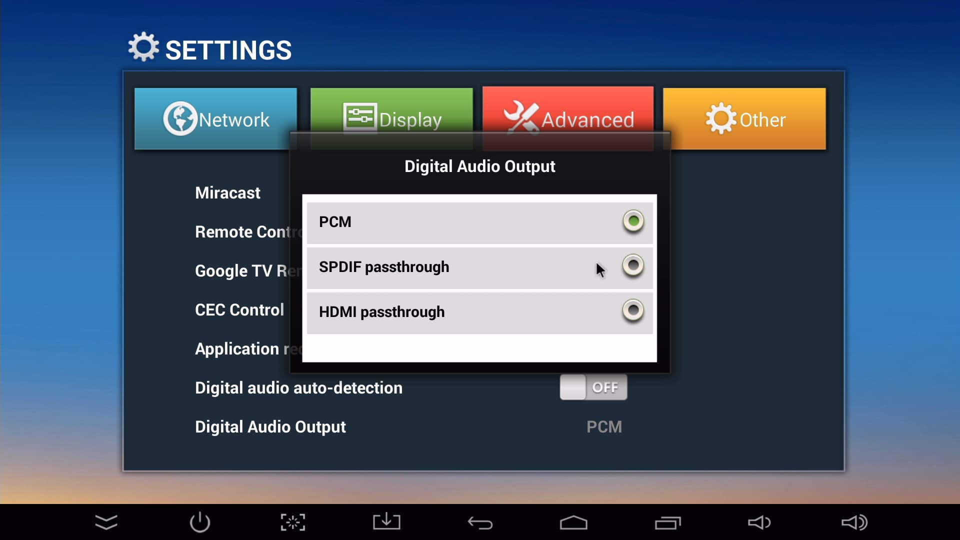 Расположенные здесь вкладки содержат настройки сети, среди которых можно выбрать как беспроводное, так и проводное подключение; параметры видеовыхода с подгонкой краев экрана; звуковые параметры с активацией режима Passthrough; общие настройки.