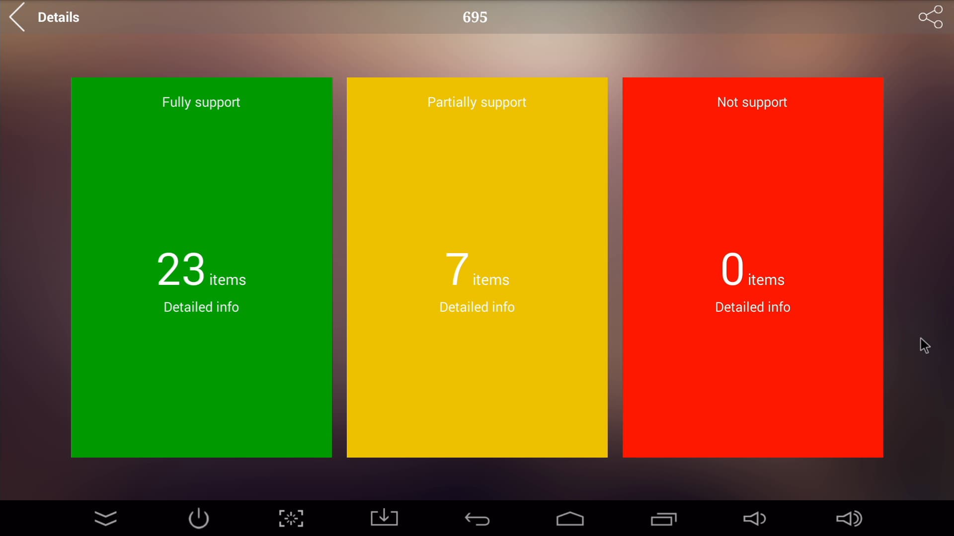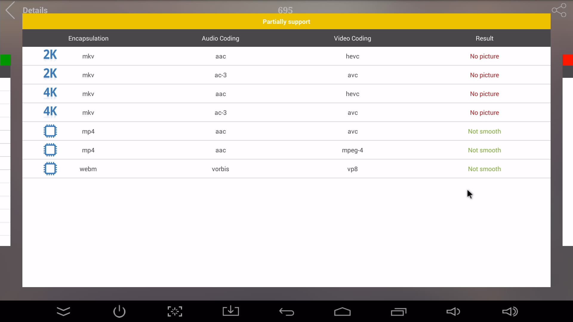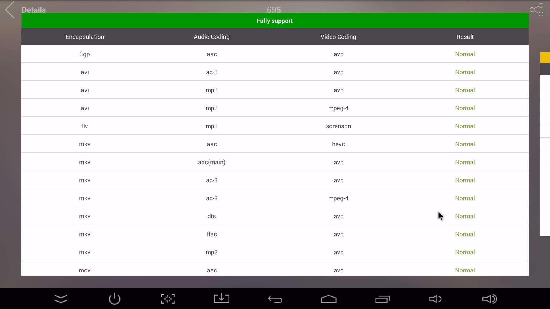 В отличие от смартфонных тестовых пакетов, AnTuTu Video Tester не проявил даже намеков на неустойчивость, быстро и уверенно проверив способность плеера декодировать имеющиеся в тестовом списке форматы. Таковых оказалось 30, с различными сочетаниями контейнеров, видео- и аудиокодеков.