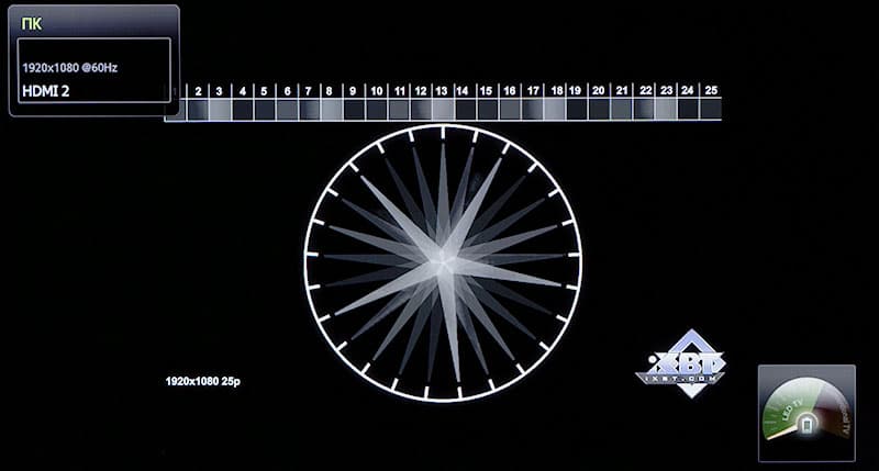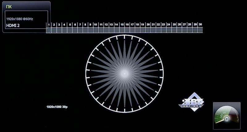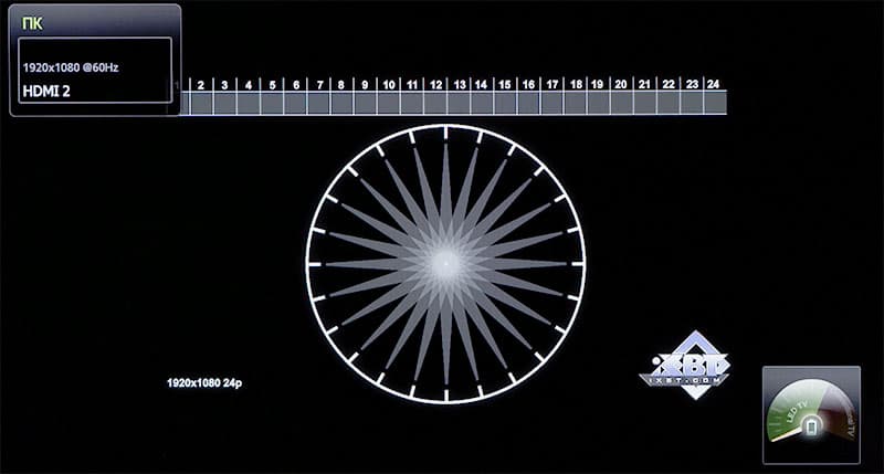 Следующий тест проводится с использованием телевизора или дисплея, на котором воспроизводится наше тестовое видео с разной частотой кадров, а также фотоаппарата, которым фотографируется экран ТВ с секундной выдержкой. К плееру телевизор подключен неизменно в одном максимальном для приставки режиме — 1080 60p. Все уплавнители и прочие «улучшалки» телевизора, которые могут внести деструктивные последствия, были отключены методом перевода HDMI входа ТВ в режим компьютерного монитора (разные модели ТВ предоставляют разные для этого способы). Итоговые фотоснимки — результаты воспроизведения тестовых файлов с бегающим прямоугольником и очерчивающей круг стрелкой — приведены ниже.