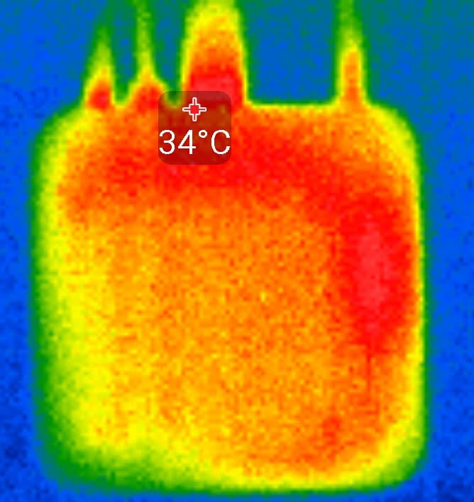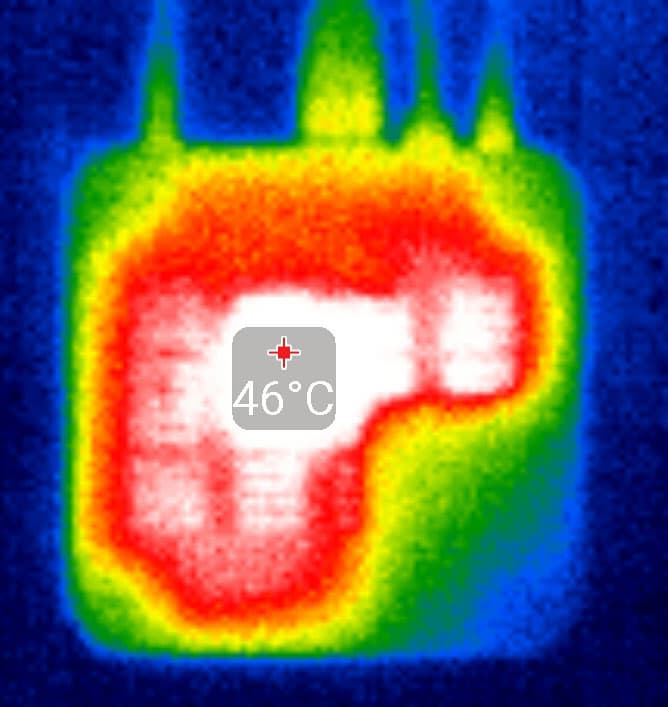Во время длительного воспроизведения видео корпус плеера практически не подвергается нагреву, лишь в нижней части через множественные вентиляционные щели «просвечивают» теплые электронные компоненты с температурой до 46 °C. Следующие теплоснимки плеера сделаны после двухчасового воспроизведения Full HD видео с сетевого хранилища, работа велась в помещении с комнатной температурой (около 22 °C).