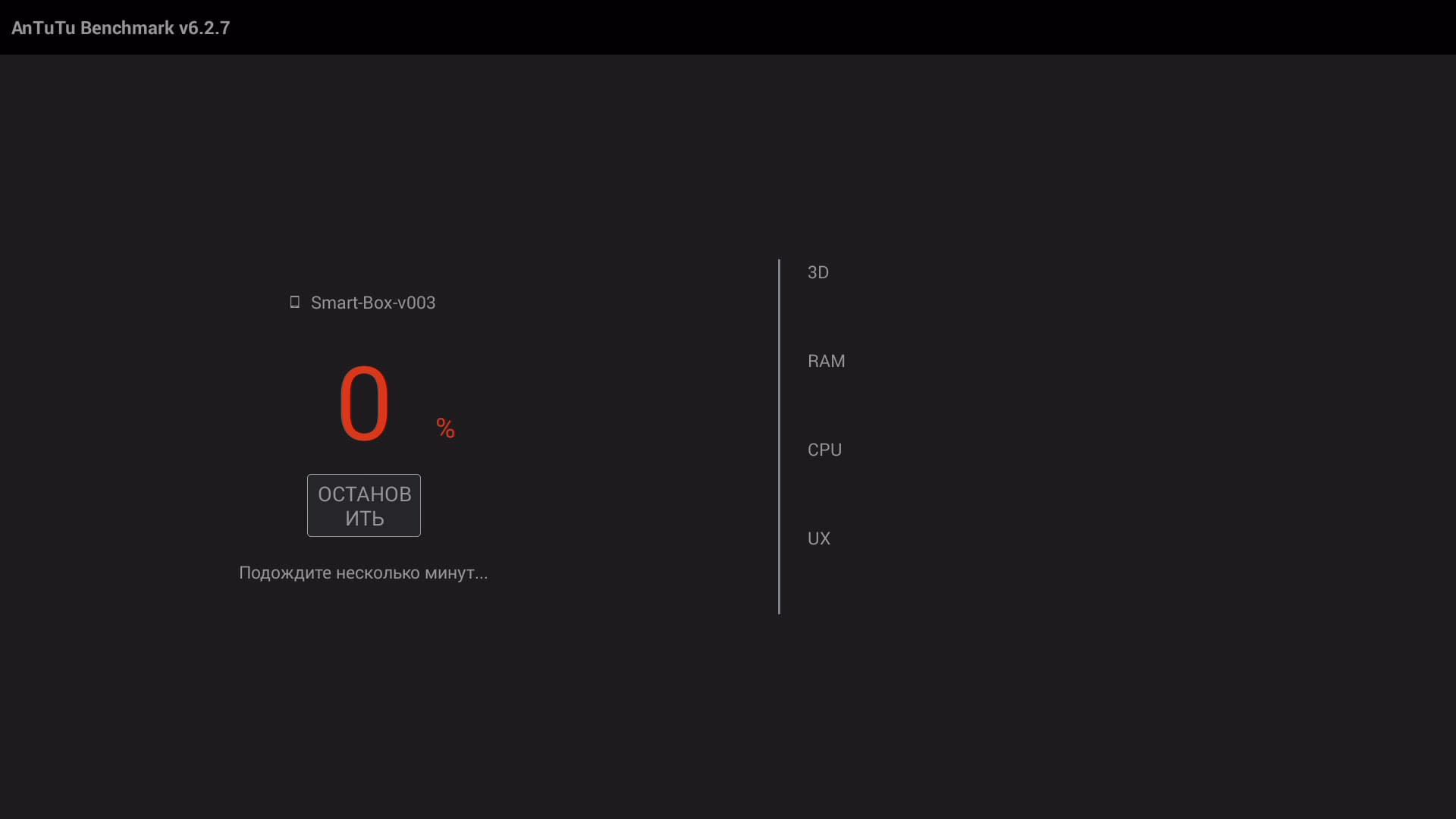 Традиционно для рассматриваемых Android-устройств попытаемся провести тестирование «мощности» нашей приставки в самой распространенной для этих целей программе AnTuTu. Установка этого пакета прошла успешно, тестирование тоже началось, казалось бы, удачно. Как можно видеть, первый шаг — 3D тест — производится с «реальным» разрешением виртуального экрана плеера, 1920×1080.