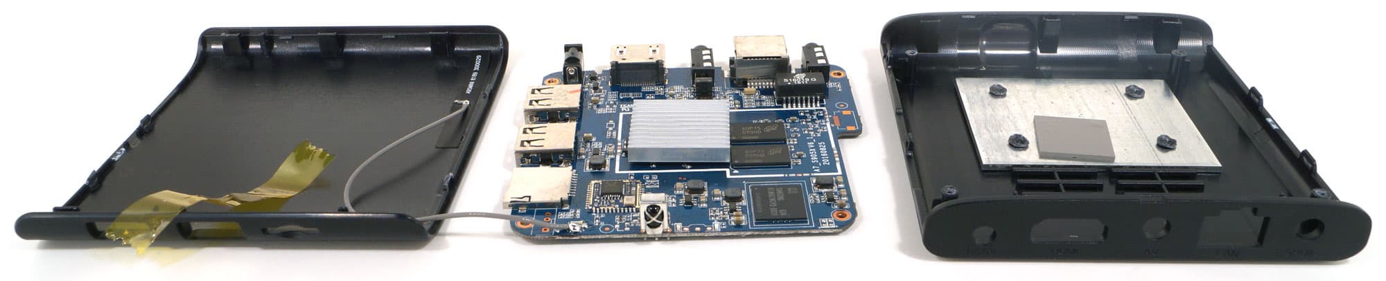 Помимо накрытой радиатором SoC Amlogic (Cortex A53-ARM8), на плате можно разглядеть некоторые электронные компоненты: