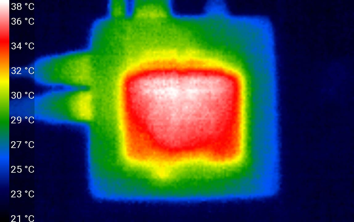 Вся эта начинка дает в работе довольно скромный нагрев. Мы сфотографировали тепловизором работающую приставку, которая несколько часов была занята беспрерывным воспроизведением 4K-фильмов в формате H.265. Тестирование производилось в помещении при комнатной температуре около 25 °C. Можно видеть, что один из участков корпуса нагрелся всего лишь до 38 °C. Нетрудно догадаться, что это за участок.