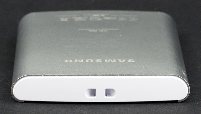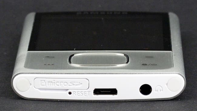 На нижнем торце находится гнездо для кабеля USB, гнездо для наушников и для карты памяти microSD, закрытое заглушкой. Там же расположен встроенный микрофон. Гнездо кабеля не очень привычное, это не стандартный mini-USB, здесь оно тоньше. Подобные кабели и гнезда можно встретить в телефонах, например, в Nokia 6500, Nokia 8600, Motorola RAZR2 V8, в некоторых Blackberry, и, наверное, во многих других. Возможно, такой тип кабеля придет на замену привычному, ведь последний не всегда можно использовать из-за своей приличной толщины.