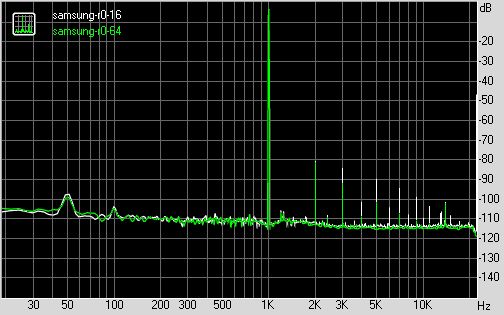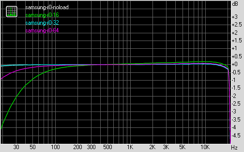 Итак, для начала посмотрим на сводную таблицу, в которой отражены искажения и АЧХ плеера Samsung R0, подключенного к звуковой карте без нагрузки, а также под нагрузкой 16, 32, и 64 Ом: