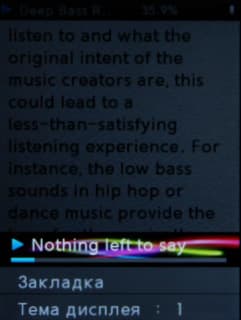 Здесь, к сожалению, все не очень хорошо. Во-первых, нет закладок. Во-вторых, что важно не только любителям аудиокниг, но и другим пользователям, плеер не умеет переходить к следующей папке после окончания текущей, это придется делать вручную. Перемотка по треку прогрессивная. Причем скорость перемотки относительно длины полосы прогресса всегда одинаковая, то есть за одно и то же, короткое, время можно домотать до конца как двухчасовой трек, так и трехминутный.