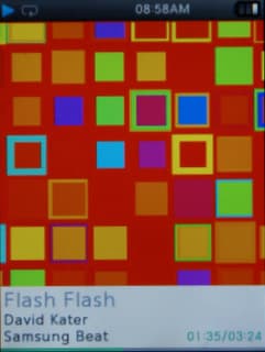 Во время воспроизведения на экране отображается стандартная информация: имя исполнителя, название альбома и композиции, есть и полоса прогресса, правда она не очень контрастная, ее плохо видно. Большую часть экрана занимает обложка альбома. Если ее нет, отображается стандартная анимация в виде крутящейся пластинки, на разных песнях она отображается на разном фоне, что вносит некоторое разнообразие.