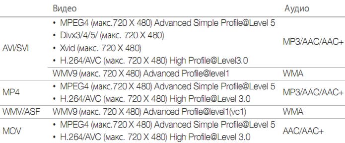 Как и Samsung R1, модель R0 поддерживает множество форматов видео и множество кодеков, причем максимальное разрешение 720*480. Предлагаем вам посмотреть на таблицу, взятую из руководства пользователя. В ней указана исчерпывающая информация о поддерживаемых кодеках и форматах видео: