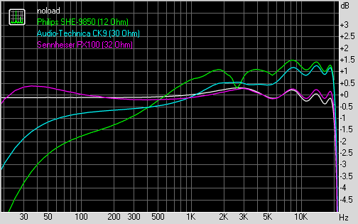 | Тест | noload | Philips SHE-9850 (12 Ohm) | Audio-Technica ATH-CK9 (30 Ohm) | Sennheiser PX100 (32 Ohm) |
