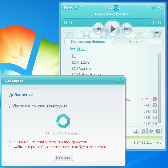 Плеер соединяется с компьютером при помощи нестандартного кабеля, это мы уже обсудили. Определяется он системой как два устройства: первое — сам плеер, туда можно скидывать музыку и любые другие файлы. Скорость копирования музыки в память составляет около 3,5 Мбайт/с, что нормально. Второе устройство, как ни странно, — некий виртуальный дисковод.