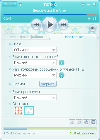 На «диске», который уже в него «вставлен», имеется программа для настройки плеера. С ее помощью можно сменить язык, на котором девушка дает подсказки, язык, которым сообщаются названия песен, а также режим эквалайзера. Перетаскиванием можно добавлять песни на устройство. Вероятно, программу было решено записать на виртуальный диск для того, чтобы ее было сложно случайно стереть из обычной памяти.