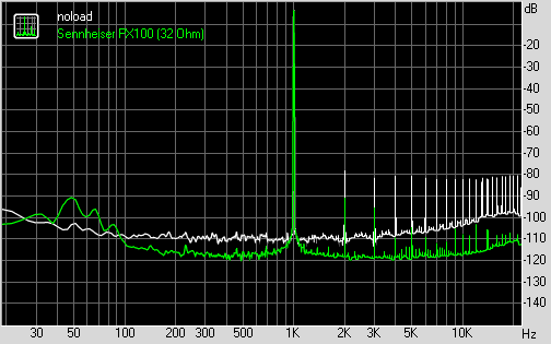 График искажений при подключении наушников Sennheiser PX100 (32 Ом) и график для режима без нагрузки: