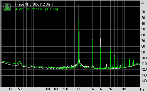 График искажений при подключении наушников ATH CK9 (30 Ом) и Philips SHE-9850 (12 Ом):