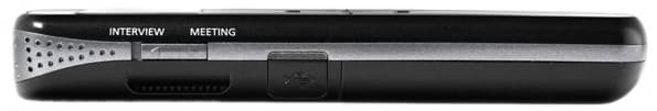 На левом торце расположен ползунок, который переключает диктофон в один из двух режимов: «Встреча» ( в оригинале «Meeting» ) или «Интервью» («Interview» ). Рядом с ним находится заглушка, под которой спрятано гнездо для USB- кабеля. Поначалу кажется, что оно стандартное для шнура mini-USB, но это не так. Нужный кабель, конечно, присутствует в комплекте, но все же непростительно в такого рода устройстве использовать нестандартные решения.