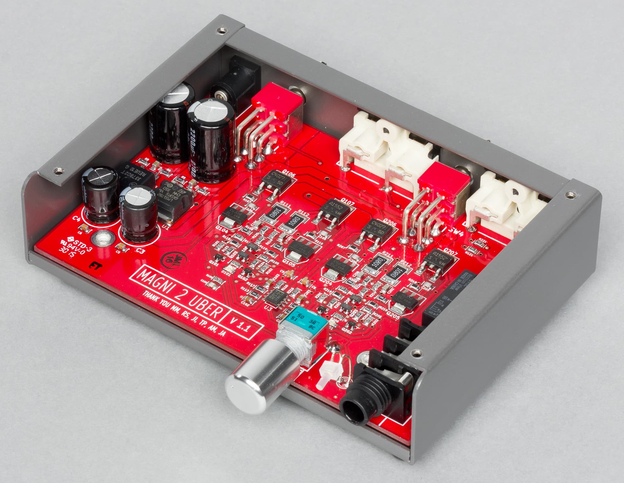 Класс усиления — AB, тракт построен на полевых/биполярных транзисторах, с неизменной глубиной обратной связи во всем диапазоне звуковых частот, все каскады связаны по постоянному току. На лицевой стороне расположено гнездо для подключения «большого» 6,3-миллиметрового штекера наушников, поворотный аналоговый регулятор громкости и такой же светодиод как на ЦАПе, только в единственном числе — горит он при включении усилителя тумблером на задней панели. Также на задней панели есть переключатель уровня усиления: Hi/Lo. Для высокоомных наушников его надо ставить в позицию Hi. Особо хотелось бы отметить наличие не только входа, но и выхода. Таким образом можно организовать сквозной канал и не перетыкать кабели. Например, включить усилитель между ЦАПом и предусилителем и использовать по мере надобности. При подключении наушников выход обесточивается. В процессе тестирования Modi 2 почти не нагревался, а Magni 2 грелся больше, но в пределах разумного.