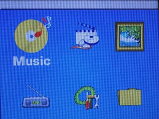 Достаточно большой дисплей позволяет использовать отказаться от таких рудиментов, как текстовые или одноуровневые графические меню. При включении наблюдаем главный экран, позволяющий перевести устройство в режим воспроизведения музыки или видео, просмотра картинок, прослушивания радио, настроек или работы с файлами (на самом деле, и первые три — то же обращение к файл-менеджеру, однако при этом «неподходящие» файлы отфильтровываются по расширению).