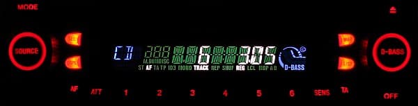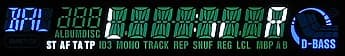 Восемь крупных сегментных индикаторов служат для отображения текста (частота радиостанции, RDS-сообщения, имя трека и т.д.). Три символа поменьше указывают номер альбома или диска. В нижней части расположена строка индикаторов текущих режимов. Справа голубого свечения область, единственная функция которой показывать уровень D-BASS. Слева индикатор типа источника звука (FM1-FM3, LW, MW, CD и т.д.) с надписью mp3, загорающейся при проигрывании CD-MP3 дисков. Разумеется восьми символов недостаточно для комфортного чтения длинных названий, тем более что прокрутка идет рывками по символам. Затрудняет восприятие информации и небольшой угол обзора этого дисплея. Все-таки в подобного рода плеерах просто необходим графический дисплей с достаточным разрешением, и, возможно, изготовленный по другой технологии.