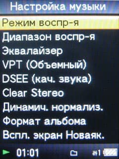 У данного плеера масса настроек звука. Эквалайзер состоит из четырех предустановленных пресетов и двух настраиваемых, пятиполосных, в которых, помимо полосного регулирования, отдельной регулировке поддается фирменный Clear Bass. Также в настройках можно включить «улучшайзер» DSEE, призванный, как сообщает производитель, повысить качество звука. Помимо этого существуют также режимы эмуляции помещений: студия, концерт, клуб, арена и т.д. — для имитации нахождения пользователя в соответствующем месте. Также присутствует фирменная технология Clear Stereo. Для выравнивания частот, на всем диапазоне громкости присутствует динамическая нормализация, которую можно включить либо отключить. Качество работы данной функции весьма спорное. Плеер на больших громкостях не дает «раскачаться» наушникам — в этом и есть назначение функции, которая, возможно, будет востребована при использовании дешевых наушников, дабы не порвать мембраны. С подобной возможностью мы сталкивались в плеерах Iriver, но там она реализована более качественно.