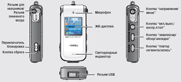 Плеер умеет записывать звук с радио, линейного входа или встроенного микрофона, причем во всех случаях запись ведется в формате МР3 (SigmaTel неспособен записывать сигнал с микрофонного входа в формате отличном от ADPCM, так что если производитель хочет такое реализовать, ему придется заметно усложнить конструкцию плеера). Линейный вход совмещен с выходом на наушники — нельзя сказать, чтобы это была первая модель с такой конструкцией, но решение однозначно стоит приветствовать: в результате в условиях нехватки места не пришлось идти на извращения типа 2.5 мм гнезда для входа ;)