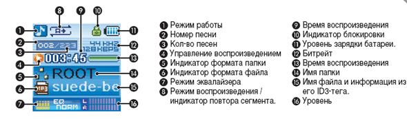 На дисплее отображается достаточно подробная информация о текущем треке, да и в режиме навигации все достаточно удобно (хотя, с учетом того, что длина имен файлов и каталогов может быть достаточно большой, прямоугольный дисплей более удобен, на мой взгляд) и красиво благодаря поддержке цвета. Тэги в МР3-файлах (ID3 обеих версий) и WMA-тэги отображаются в формате «автор/название» без каких-либо ограничений, проблем с русскими буквами никаких. К сожалению, в OGG-файлах тэги пока не поддерживаются.