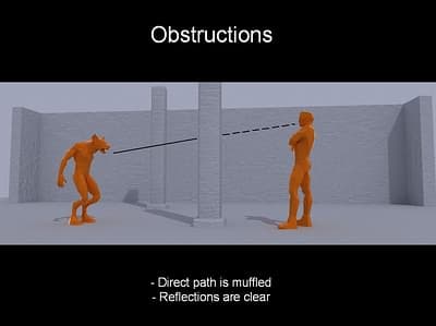 - звуки могут так же проходить сквозь объекты, такие, как вода или стены (occlusions или звук, прошедший сквозь препятствие).